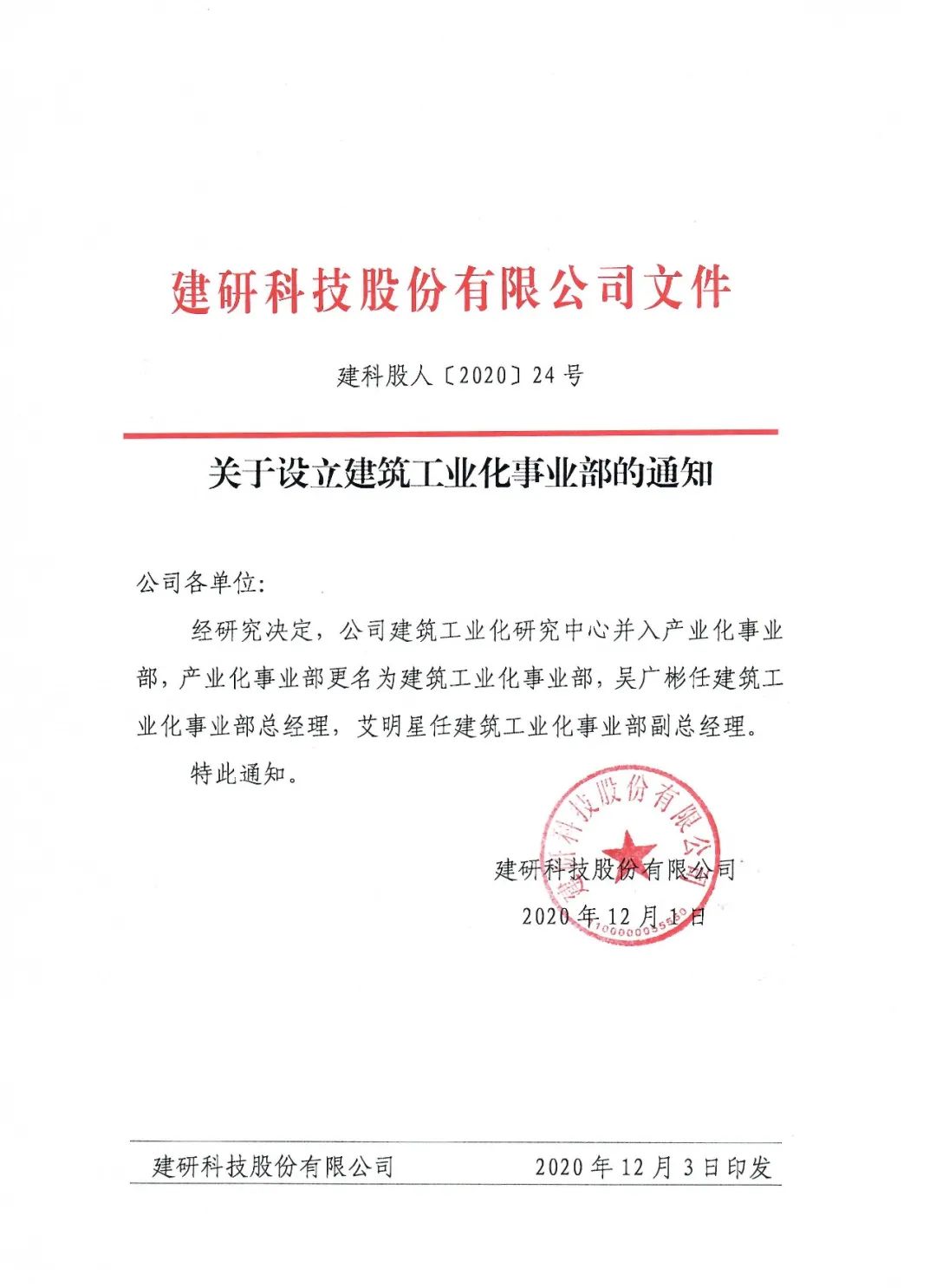 2020年12月31日,建研科技通過線下與線上結合的形式召開了建筑工業化事業部成立大會。