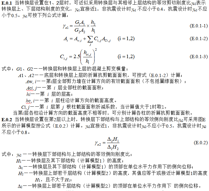 圖E 轉換層上、下等效側向剛度計算模型 E.0.3 ?當轉換層設置在第2層以上時,按本規程(3.5.2-1)式計算的轉換層與其相鄰上層的側向剛度比尚不應小于0.6。 |
