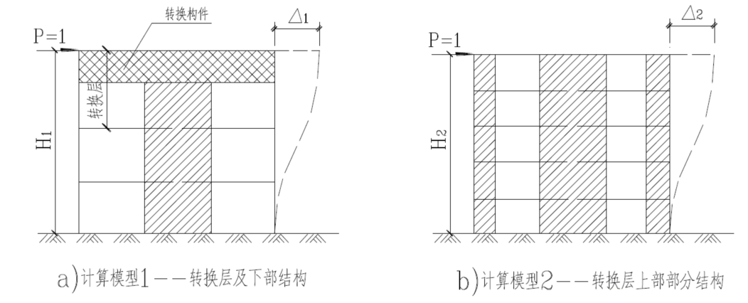 由于這種算法沒有考慮結構體系中支撐斜桿及水平桿件(比如連梁等)的剛度貢獻,也沒有考慮上下樓層的約束作用,因此,其適用范圍有一定局限?!陡邔咏ㄖ炷两Y構技術規程》規定,該方法主要用于轉換層位于底部一、二層時,轉換層上下剛度比驗算及結構嵌固條件復核。