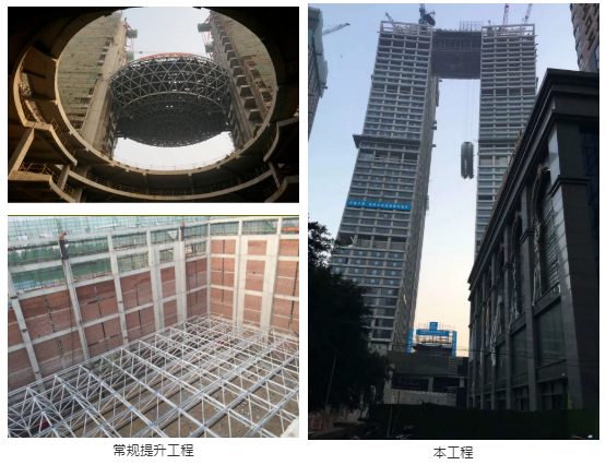 常規(guī)提升工程提升重量大,提升過程受風(fēng)面積小,通常不考慮風(fēng)荷載的不利影響。與常規(guī)提升工程不同,本工程為“超高、超輕”結(jié)構(gòu)的提升,提升重量輕(單次提升重量為45t),提升高度近200m,受風(fēng)面積大(帶幕墻提升),且工程地點(diǎn)位于長江與嘉陵江兩江交匯處,風(fēng)力較大,因此,風(fēng)荷載是必須考慮的關(guān)鍵因素。此外,與常規(guī)提升工程相比,本工程仍具有提升邊界條件復(fù)雜、提升吊點(diǎn)布置復(fù)雜、結(jié)構(gòu)剛度弱等難點(diǎn)。