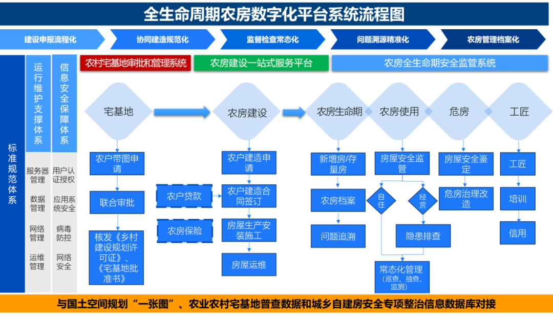 因此,中建研科技基于國產數字平臺研發了智慧農房全過程數字化平臺,該平臺包含了農村宅基地審批和管理系統、農房全生命期安全監管系統,以及農房建設一站式服務平臺。建立了農房用地、規劃、建設、使用全過程管理制度,為農建房提供了一站式服務。