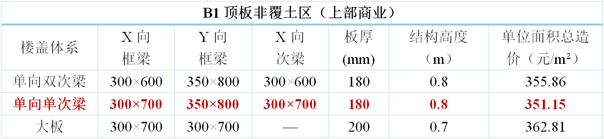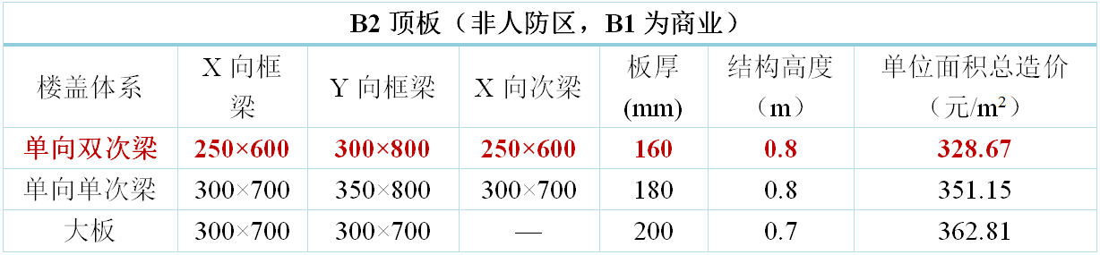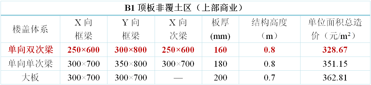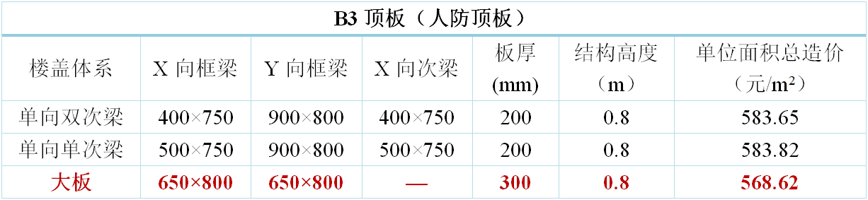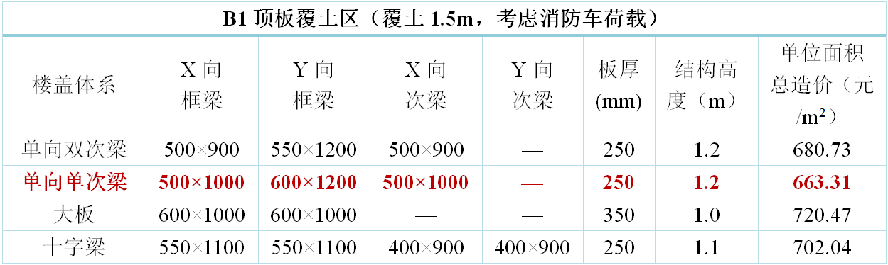 地下室樓蓋方案原則上考慮三種方案布置:主梁大板、單向單次梁、單向雙次梁。其中,地下室頂板增加考慮十字梁方案。