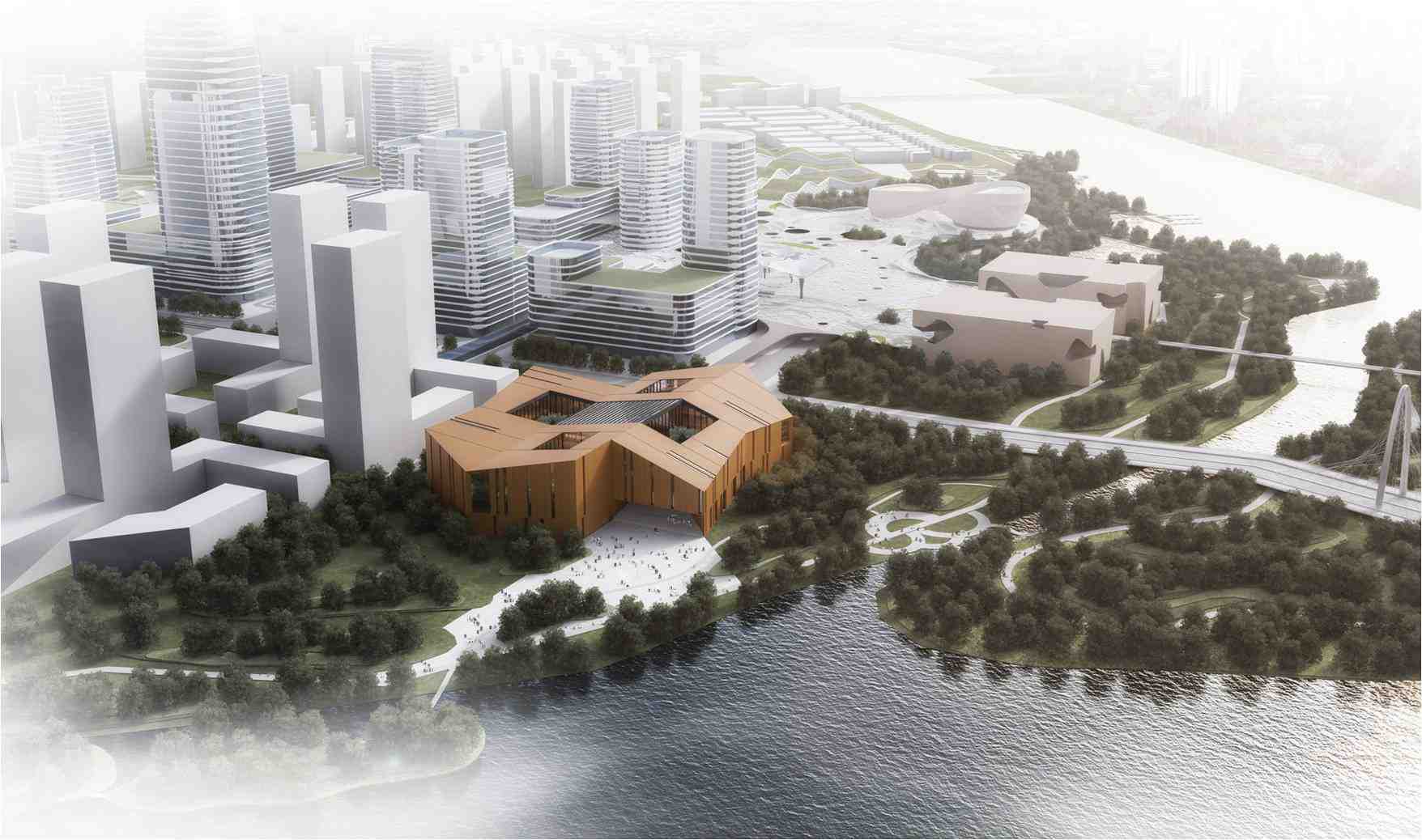 在布局上,兩館統(tǒng)一在一個建筑形體中,居中布置了共享大廳,圖書館和檔案館的功能,分別設(shè)置在建筑的西北側(cè)和東南側(cè)。在共享大廳的南北兩側(cè)設(shè)置了室外庭院,共享大廳、室外庭院、大臺階共同將西側(cè)城市道路與沿河景觀相連接,為市民提供一休閑、交流的文化場所。 緊湊的建筑布局及外觀,不僅體現(xiàn)了功能的要求,也反映了邏輯鮮明、不證自明的空間秩序。地塊呈不規(guī)則形態(tài)。建筑外形采用折面的建筑語言,這是建筑對不規(guī)則場地的主動適應(yīng),使得建筑能夠更好地與環(huán)境融為一體,生長于這一特定場所的建筑成為了獨(dú)一無二的作品。與自由不規(guī)則的外輪廓相比,建筑的內(nèi)部空間通過十分規(guī)則的網(wǎng)格系統(tǒng)進(jìn)行分割組織,使得各個功能區(qū)得以明確的界定,并實(shí)現(xiàn)高效的內(nèi)部交通組織與經(jīng)濟(jì)合理的結(jié)構(gòu)選型。折面的屋頂是折形立面的延續(xù),在使用了相同的立面材料后,整個建筑外觀渾然一體。外墻材料采用彩GRC掛板,而且選用明快的橘紅色,結(jié)合折線變化的建筑造型,簡潔并富有現(xiàn)代感,成為天津中新生態(tài)城核心區(qū)重要的標(biāo)志性建筑。