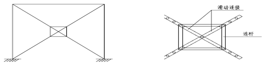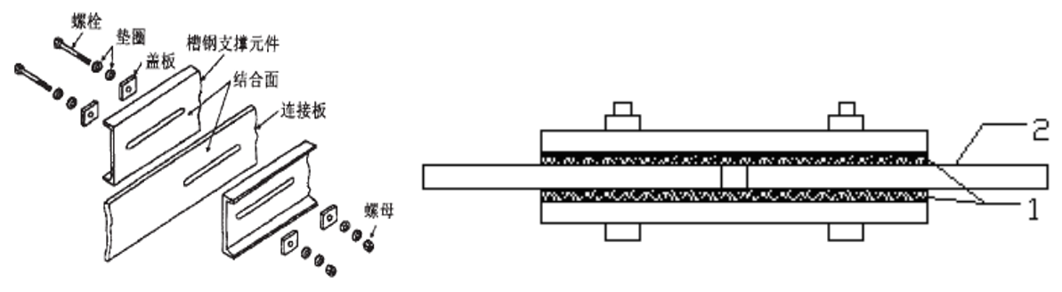 普通摩擦消能器的核心部件如圖3所示。是通過開有狹長槽孔的中間鋼板相對于上下兩塊銅墊板的摩擦運動而耗能,調整螺栓的緊固力可改變滑動摩擦力的大小。滑動摩擦力與螺栓的緊固力成正比,另外,鋼與銅接觸面之間的最大靜摩擦力與滑動摩擦力差別小,滑動摩擦力的衰減也不大,保證摩擦耗能系統(tǒng)工作的穩(wěn)定性。