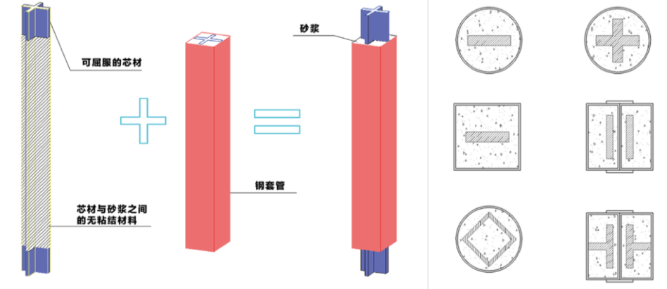 屈曲約束支撐由芯材,無(wú)粘結(jié)填充材料、約束外套筒組成
