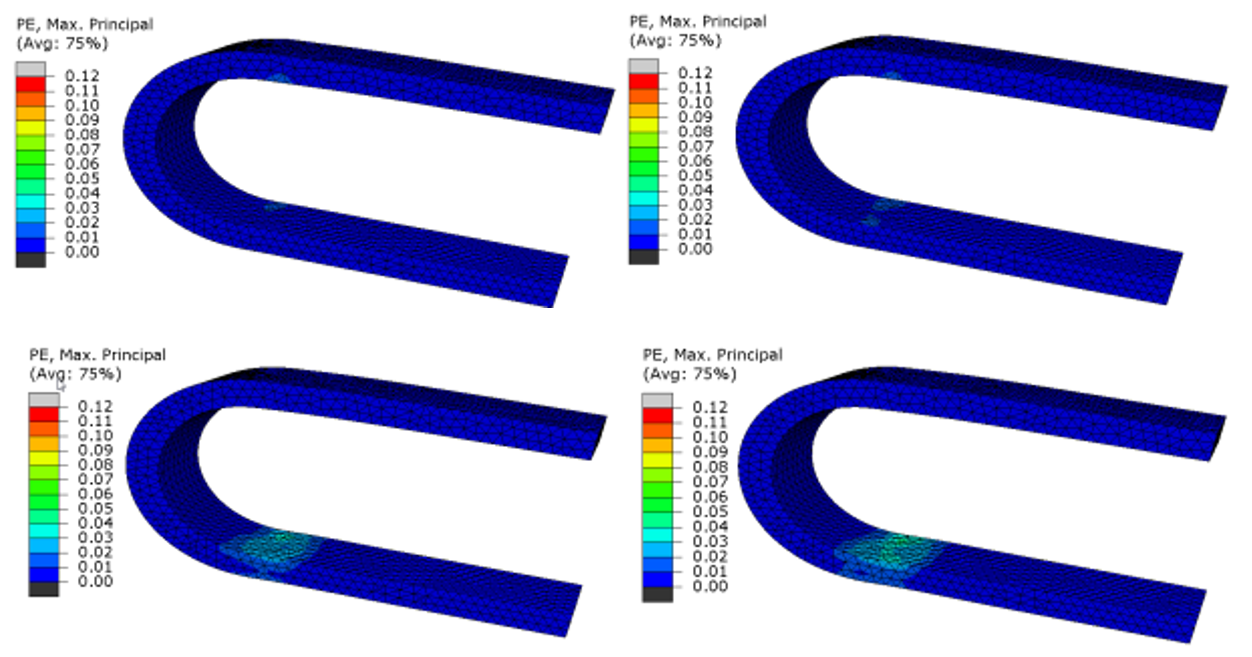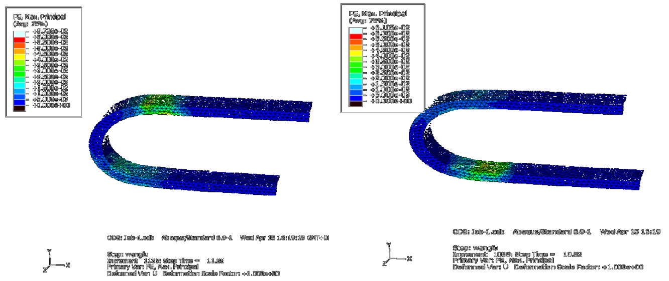 當(dāng)阻尼器上下表面發(fā)生強(qiáng)制水平相對(duì)運(yùn)動(dòng)時(shí),U型耗能部在上下約束板的約束作用下,以其彎曲部分的曲率中心為轉(zhuǎn)動(dòng)圓心發(fā)生連續(xù)彎曲變形,因此,該阻尼器中U型耗能部的塑性變形位置將隨變形移動(dòng),保證了阻尼器的塑性變形在大范圍內(nèi)均勻分布,提高耗能部的利用效率,實(shí)現(xiàn)大變形下阻尼器的耗能性能穩(wěn)定。