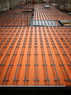裝配式可拆卸鋼筋桁架樓承板是將鋼筋桁架與底模通過(guò)專用扣件連接而成,施工階段主要由鋼筋桁架承受荷載,待樓板混凝土達(dá)到設(shè)計(jì)強(qiáng)度后,底模可拆卸的鋼筋桁架樓承板。