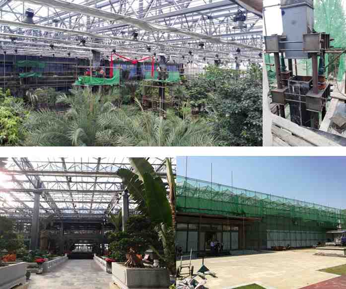 國道南生態園平面尺寸84.950m×39.80m,結構高11.750m,建筑面積3381.01㎡。原結構設計為單層鋼排架結構,柱網尺寸為9.9m×20m、6m×20m、10.8m×20m三種,屋面設計為陽光板屋面,配有遮陽、內遮蔭、微霧、集露、通風系統等。該建筑物于2015年建成投入使用,現根據業主需要,結構頂標高需提高3.8m。施工采用時采用整體同步分次頂升方法,實施時,完全不動屋面陽光板、遮陽等相關設施,完全滿足業主要求。